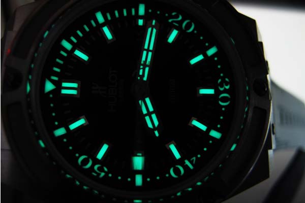 光線在水中會不斷遞減,不止4000米水下,大概兩百米的水底就不會有光線了,但身為一只腕錶,在任何時地都能夠清楚辨識是最基本的要求才是,在這款King Power Oceanographic 4000上,HUBLOT自然相當認真的處理這部分,面盤包括面盤、刻度環及指針,接大範圍的塗上SuperLuminova™ 專業長效夜光塗料,大面積除了視讀方便之外,夜光塗料是需要先吸光,當光線微弱時才會散發光芒,質量多,反光的效果與時間都會更好。King Power Oceanographic 4000據說在視線不良時,距離25公分也可輕易辨識時間。