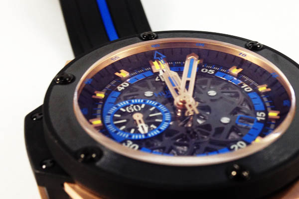 這次介紹的這款是烏克蘭,採用的是HUBLOT自己調配的King Gold合金,這是黃金與白金的結合。錶圈則是以陶瓷打造。貫穿面盤與錶帶的藍色,是烏克蘭國旗的藍色,以此傳達這款腕錶的象徵意義。