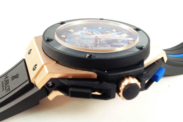 Fusion融合,是HUBLOT近乎執著的理念。所使用的King Gold便是金與白金的全新融合?此外,呼應到錶身上,可以看到HUBLOT採用不同材質所堆疊出的錶身設計,上下兩片King Gold錶殼,然後加上陶瓷錶圈、橡膠側緣。而錶殼側面的夾層則是黑色複合樹脂製作。這是HUBLOT設計上的大特色,相當好看。