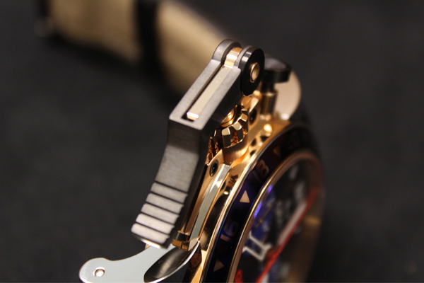 Chronofighter Oversize GMT最大的特色,自然是巨大的計時按把。雖說大錶本身已經相當顯眼,腕錶直徑47mm真的是個大個子。但,加上這巨大的按把,視覺魄力更倍增,47mm的直徑,感覺突然變成47公分般的醒目!特殊的設計,讓整只錶…該怎麼說呢?……殺氣騰騰!