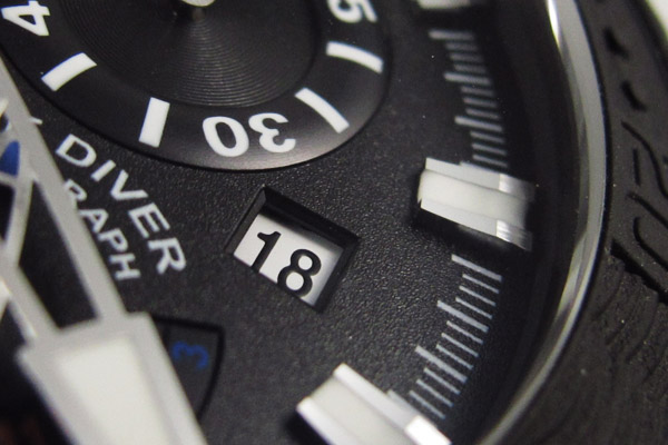 錶圈的刻度,可以協助腕錶進行粗略的計時。不過…由於是包覆黑色的硫化橡膠,並不容易看出刻度上會有什麼東西。除了12點鐘的夜光亮點外,當進入視線不清的地方時,錶圈就是一片黑了。雅典大約心中也明白如此設計裝飾意味比較濃厚,因此也就非常大膽地為錶圈加上波浪裝飾,呼應錶款的海洋風。
