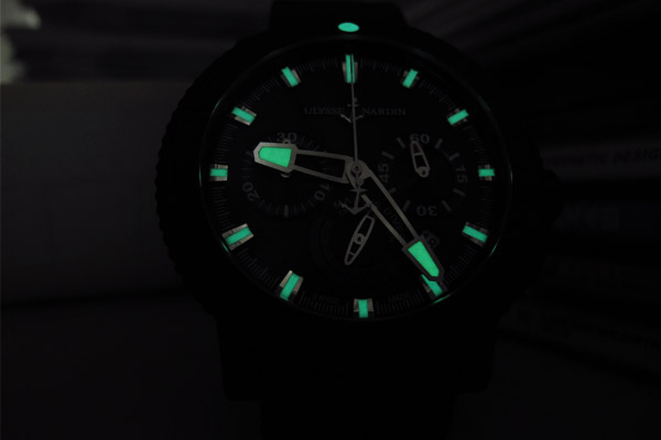 好!最後,要說的是夜光,潛水錶最需要的就是夜光。因為在水中的光線是非常微弱的!電影裡面游泳的人張開眼睛都看到閃亮的海水!但那是在游泳,而且那是電影(電影就算到海溝裡面,都會很明亮。),光線進入水中,可見光會越來越少,因此就會越來越暗。瞧這錶名就叫做Black Sea黑海,就說明了海底有多嘿!夜光很重要,這次稍微測試一下夜光,亮度令人滿意,12點位置錶圈的夜光圓點,同時也能當作標示12點的依據。