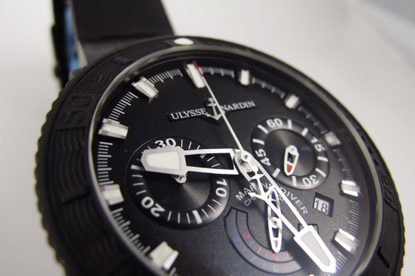 這次到手的,是ULYSSE NARDIN雅典所發表的Black Sea潛水計時腕錶,先不論什麼其他的了。光是外型就有夠捍!不鏽鋼錶身包覆黑色橡膠塗層,怎麼說呢?感覺上就好像是穿上了蝙蝠裝時候的蝙蝠俠,整個戰鬥力十足,隨時都殺氣騰騰似的。