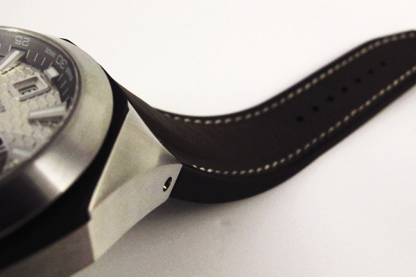 源於桂冠系列的黑色八角形錶環,從側面可看到並非單純壓在圓形錶圈下,而是鑲嵌於錶身中,讓錶殼有更強烈的層次感。造型強烈的錶耳,設計同樣源自於桂冠系列。搭配特殊設計的皮革錶帶,皮革內側接觸手腕的部分為橡膠材質,能加強錶帶被汗水侵蝕的問題,常保配戴的舒適度,而且看起來也非常的好看。