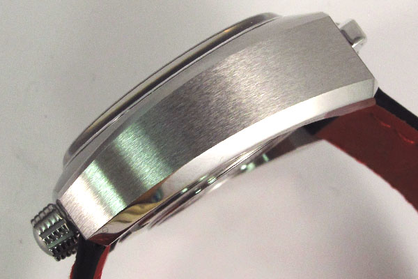 資料上記載錶殼尺寸43mm×43m,如此概論其實有些盲點,因為這所計算的是錶殼最長與最寬處。可這只腕錶的設計並非對襯,從正面觀之,上寬下窄;從側面觀之,同樣是個上厚下薄的弧形身段。搭配計時按把,還真有點牛頭樣。