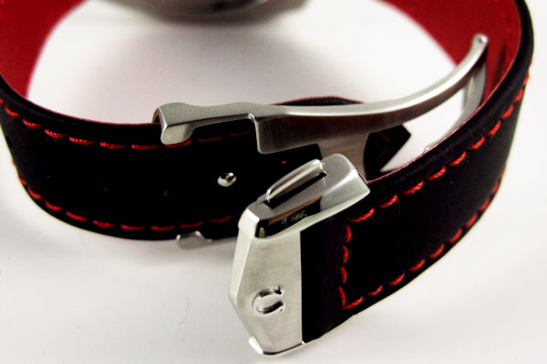 黑色皮錶帶搭配紅色縫線,非常有運動錶的感覺。錶款搭配彈簧扣,只需按壓左右兩側的按把,即可輕鬆穿脫。兼具便利與安全性。