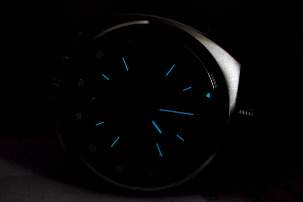 藍色夜光時標,在昏暗的地方的表現相當優秀。指針與時標都相當清晰。而在旋轉內圈部分,僅在0的指標上設計三角形夜光標示點。雖然可以雞蛋理挑骨頭的說少了精準度,可在實際使用上,如此設計較能夠排除過多資訊,達到基本清晰判讀的需求。
