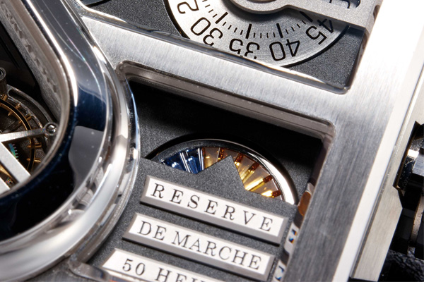 機芯設計毫不依循傳統理路,所有齒車配置完全獨樹一格,擒縱結構突出於機芯之上,或說整枚手錶之上;硬要照傳統手錶機芯的理路來看,它應該屬於三板式的結構,把發條盒跟二番車放在一「區」(事實上是四塊橋板),三番車以下是一區,而擒縱結構是另一區,這很明顯是現代電腦輔助設計下的產品,它能把機板面積做最有效的運用,但完全不考慮維修保養的便利性。事實上,這麼複雜的雙陀飛輪錶似乎也不必考慮這點。