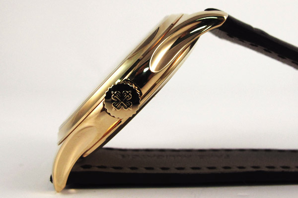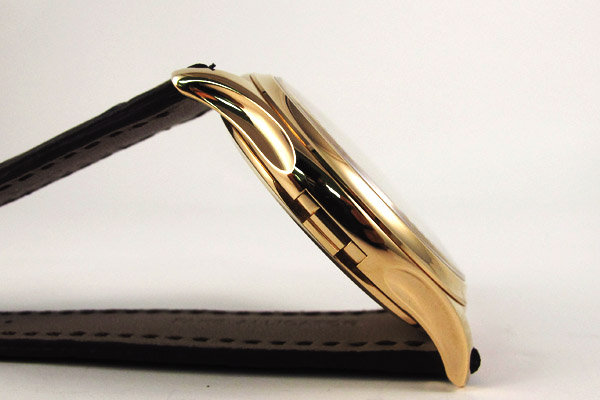厚度是纖薄的9.4mm,側面可見從錶身中央向外延伸至錶耳的弧形溝槽,這樣的設計為單純的圓形錶身增加了幾許變化。比例濃纖合度看來優雅大器,展現出屬於百達翡麗不疾不徐的設計態度。就如同一瓶保存良好、年代久遠的佳釀。時間磨掉過多的銳利的尖角,並讓味道更完美的混合,讓酒的味道溫和但濃郁。初入喉時或許甚無感覺,但未幾便會在舌尖、喉頭繃發出各種韻味,接著一直到溫暖整個胃。平淡,卻又充滿層次;簡單,但又相當複雜。