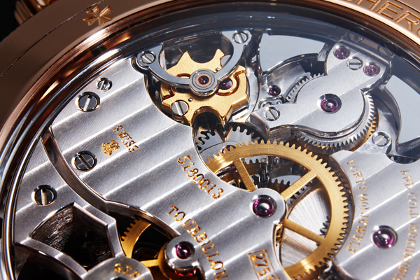 所以Patrimony Traditionnelle Caliber 2755是目前廠方所生產的最複雜腕錶(除了Tour de l'Ile腕錶之外);錶款內部所搭載的Caliber 2755手上鍊機芯,正是以當年的Caliber 2750機芯的基礎所建構而來。因為Caliber 2750機芯在上層與下層的部分,都分別加裝眾多的功能模組,位於中間的基礎機芯,實際上是一枚三問陀飛輪機芯;也就是說這枚基礎機芯,原本就具有三問與陀飛輪功能,因此本款腕錶所使用的Caliber 2755機芯,則是在上方加裝一層萬年曆模組。所以十分講究原始設計結構的三問報時功能,以及精密結構的陀飛輪裝置,在當初的設計階段時,就完整的納入規劃,因此本機芯整體的性能,相信是無庸置疑的。相較於小尺寸機芯,大尺寸的機芯在報時功能的優勢,來自於強而有力的發條、大型音錘與音簧,因此Caliber 2755機芯採用33.3mm的直徑,自然可以提高報時的聲響。另外江詩丹頓針對傳統的減速器加以改良,推出離心式減速器(centripetal governor);這項屬於三問錶所必備的裝置,能穩定音錘敲擊音簧時的速率,以分開且平穩的速率來表達時、刻及分,如果缺少了此項裝置,只能產生急速並難以識別的敲擊音階。而江詩丹頓推出的新裝置具有兩個砝碼,用作調速器旋轉軸的制動器,以相對的離心力及向心力平衡了問錶彈簧所釋放的能量。當調速器轉動時,離心力以砝碼的其中一端為中心,而另一端則為中央軸的制動器,使整個旋轉及敲響報時的速度更為平穩。這項獨特的裝置減低了傳統減速器所產生的噪音問題,可提高報時功能的聲音品質。