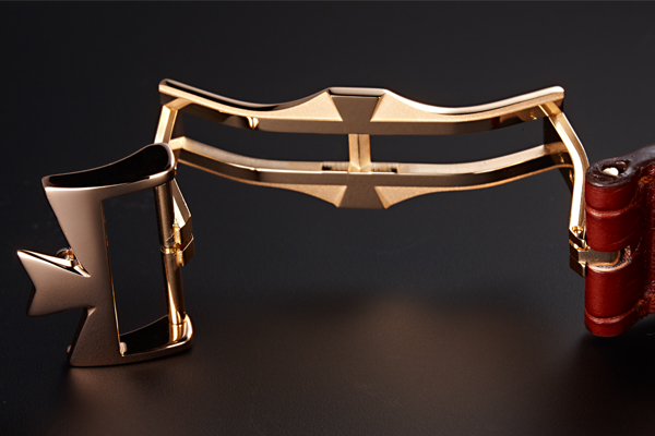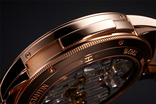 一般來說,大複雜功能腕錶要在面盤上呈現完美且毫無阻礙的陀飛輪裝置,幾乎是一項不可能的任務。原因就在於複雜的萬年曆與三問報時零件,這兩項功能至少涵蓋三、四百個零件,要避開下方的陀飛輪裝置,絕對是一項大工程;但是受惠於廠方的原先的設計概念,廠方只需要製造一個精巧的萬年曆模組,即可解決上述的問題。因此本款腕錶的萬年曆使用傳統的三圓盤顯示,這樣一來可減少阻礙陀飛輪前方的空間,佩戴者可完整的觀賞陀飛輪的運行姿態。在錶殼上方的錶帶接縫處,有一個隱藏式按鍵,可調整月份與閏年;而錶殼左側的兩個隱藏式按鍵,上面的可以調整日期,下面的則可調整星期功能。透過藍寶石透明底蓋的設計,可看見機芯的右側具有動力儲存顯示,可以從0指示到55小時,對於手上鍊機芯來說,無疑的具有高度實用性;而左側的相對位置上,則有鐫刻一枚日內瓦印記,對於頂級的複雜腕錶來說,其價值勝過千言萬語。