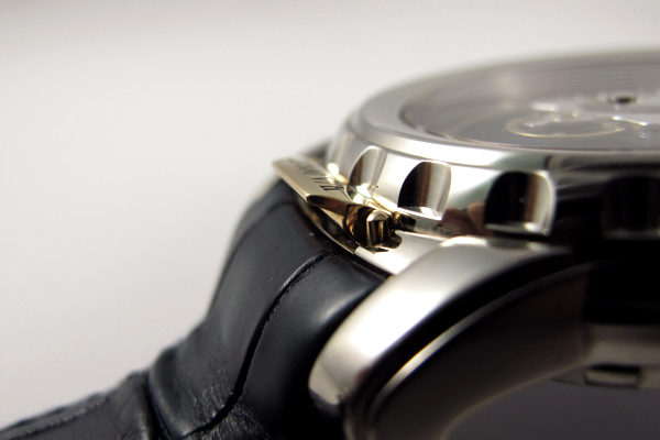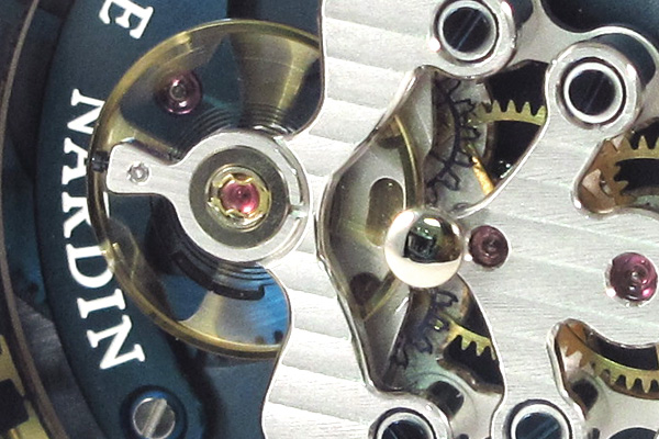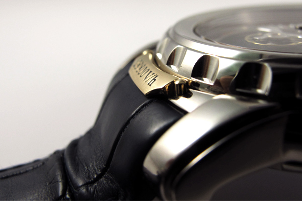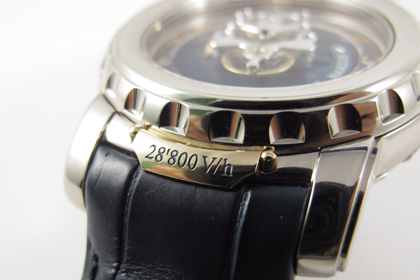 為了避免意外而造成走時調整,雅典為校時錶圈設計了一組安全機制,撥開六點鐘位置標示28,800V/h的金屬牌,便是打開安全鎖,可以轉動錶圈進行校時。而如此也不難明白雅典將錶圈溝槽刻意作得如此深的緣故,這都是為了方便轉動調校所用。