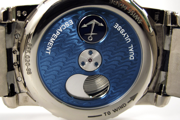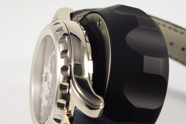 錶款名為Freak,奇思異想的部分可不僅只是將指針與卡羅素機制結合。圓形錶殼有著加大的齒溝。當然,相信一看也會注意到這只腕錶並沒有錶冠的設計。錶款趣味由此而生,一般錶冠用以上鍊與調校,而少了錶冠的Freak該如何達到這兩一項功能?一般邏輯自然是將之移至錶背隱藏錶冠。但翻看錶冠,背面同樣雲淡風清!