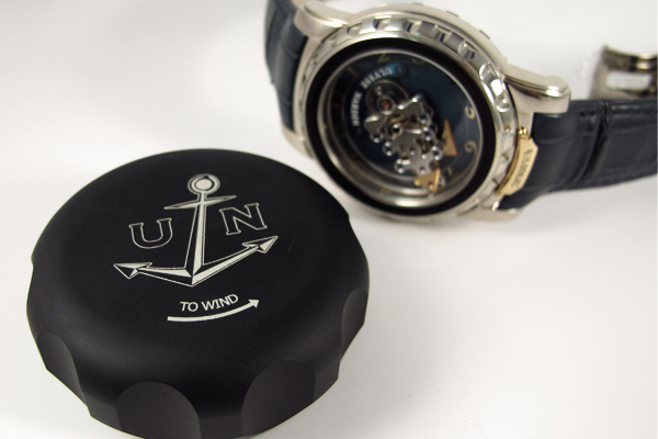 腕錶上鍊是轉動錶背的錶圈,轉一圈能為腕錶提供12小時的動力。雖說直接轉動下錶圈亦是可以上鍊。但即便有著深刻的溝槽,但經過實際測試,直接用手轉的效率並不佳。因此,雅典特別設計了一枚方便上鍊的金屬塊,黑色金屬塊能夠錶背密切結合,以節省上鍊的力氣。不過這枚上鍊工具本身也沒什麼秘訣,就是一個能夠與錶背密合,很有質感的金屬塊罷了。