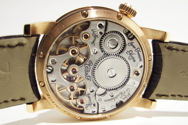 古典風格的機芯,當然一定要是手上鍊的。透過一枚發條盒推動兩組齒輪系。錶背上同樣鐫刻著負責這部分的大師名號,研發處理運作問題的是Jean-François Mojon,而為機芯妝點打磨的則是Kari Voutilainen,兩位皆是曾經獲得日內瓦鐘錶大賞的大師級人物,也是打造LM1的原班人馬。機芯上鐫刻著帶著古典花俏的英文字體,感覺相當的好。