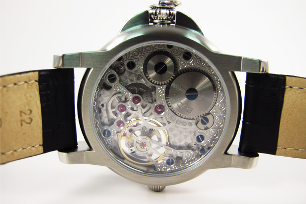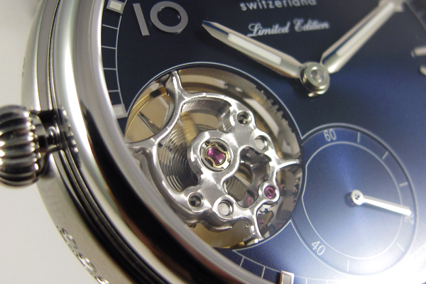 八點鐘位置的開心視窗,可以直接透視擒縱機制。這部分當算腕錶運作最勤勞的部分,在此處開洞讓人能直視機芯運作,擒縱叉便靠近一旁的小秒盤處,機芯運行時,讓人能感受到一股豐沛的生命力。此外,細緻的橋板設計,讓鏤空處展現出通透美感,這部分也頗引人注目。