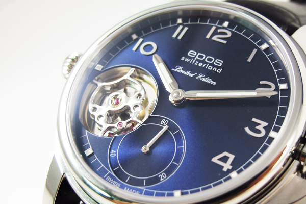為了烘托八點位置的開窗,因此面盤整體設計的非常簡約。俐落的時標與軌道紋,構築出面盤的主要風格,也更讓人能一眼便看到八點位置視窗。不過一如錶款所希望帶給人們的多元變化,epos也同時發表三種不同顏色面盤。除了此款湛藍色面盤外,另外還有銀色與鐵灰色兩種。