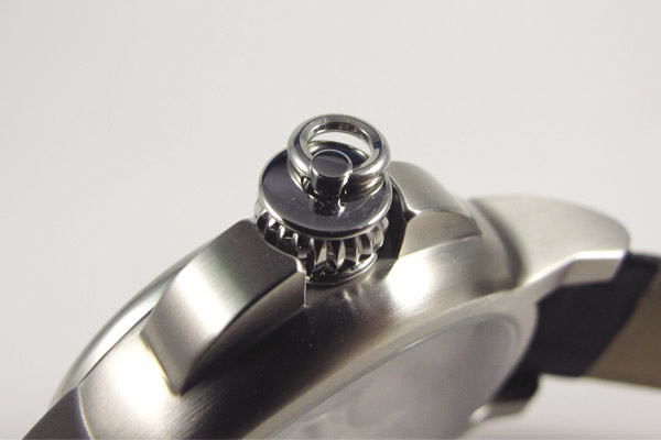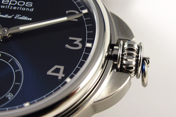 錶殼拆解的秘密就藏在三點鐘位置與九點鐘位置的錶冠上,乍看之下,若是不明究理可能會以為這是一只雙錶冠設計的腕錶,然而並非如此。九點鐘位置錶冠的主要功用是鎖定內外兩層錶殼。而三點鐘位置的錶冠,除了肩負上鍊與時間調校的功能外,同時也兼具鎖定功能。epos巧妙地利用、結合懸入式錶冠的設計,達到固定內外錶殼的功能,設計上非常的直覺,當然在使用上也增添便利性。