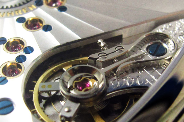 同樣承襲傳統德式韻味的設計還有鵝頸式微調,此機制主要功能是調節擺輪的擺動速度,進而改變走時速度,因為結構形似鵝頸而得名。製錶師或維修師可透過頸部的微調螺絲,便能夠更細膩地調校至精準。這是傳統德國高級製錶所會加入的設計。NOMOS首度使用如此設計。由於這枚機芯採用3/4夾板,鵝頸微調的存在便更顯重要(雖然兩者之間的發展並無關連)。3/4夾板的好處是能夠將齒輪機件固定的更穩固,使零件齒輪更穩定安全。但當需要維修調整時,便需將整片夾板取下,其實稍嫌不便。有了鵝頸微調設計,不需動到機芯其他部分,也能達到調校之功,便利許多。