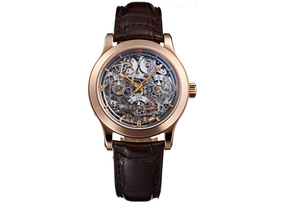 而本款腕錶使用的萬年曆結構,依然是多面盤設計,除了三點鍾的日期指示,九點鍾的星期、月相指示,以及六點鐘的月份、年份指示之外,十二點鐘位置分別是動力儲存顯示與日夜顯示。然而本款腕錶,與先前的非鏤空版本的差異在於,本只腕錶採用透明的藍寶石水晶碟盤設計,當碟盤運轉到銀白底色的位置時,文字便清晰可見;而前一代的款式則是使用指針設計。而本錶款的萬年曆調校功能,與大部分的萬年曆腕錶並不相同,使用者可透過錶殼左側下方的隱藏式按鍵來快速調整,每按壓一次,就代表日期前進一天,所以其他的時間資訊也都是同步移動,使用者無須擔心無法校對出正確的時間,因為在百年之內的所有時間資訊,都已經設定在萬年曆結構之中。使用者唯一需要擔心的是,日期不可調整過頭,這樣必須等到錶款停止數天之後,才可調整回正常的日期。而在日夜顯示功能的下方,有一個小視窗,在晚上九點至凌晨三點時會出現紅色,這是告知使用者,在此時不可操作快調按鍵。
