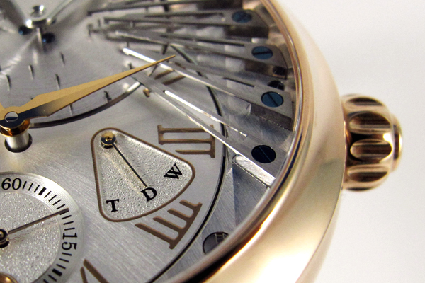 為操作便利所設計的錶冠功能選擇器,按壓錶冠上的按鈕選擇功能,無須拔出錶冠即可操作功能。四點位置扇形盤則會指示當下功能。