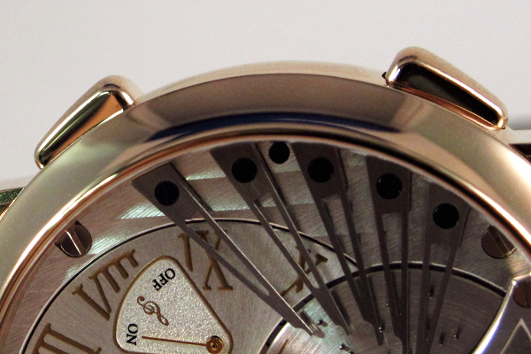 八點鐘位置有著高音譜記號的扇形盤,以ON與OFF提醒配戴者目前腕錶音樂狀態。透過十點鐘錶側的按把設定,是訂音樂是否整點演奏。