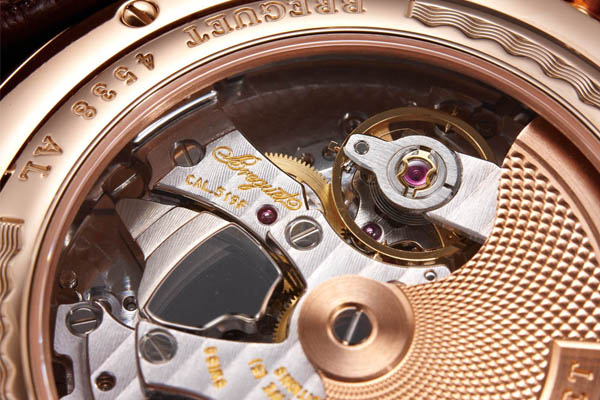 機芯的製作品質完全符合瑞士頂級錶的要求,打磨及細節處理一絲不苟,這枚錶搭配玫瑰金殼,也用上玫瑰金自動盤,看起來整體感極佳。它的儲能為45小時,當然這是在不啟動響鈴的情況下;雖然沒有特別註明,但游絲及擺輪組合已經是無卡度游絲及微調擺輪,調整方便性及走時的精確度都有保障。