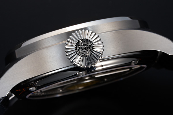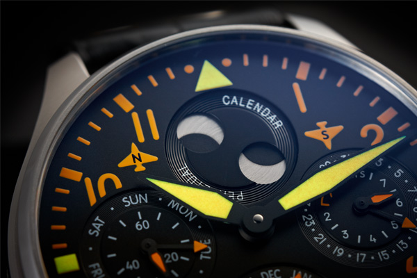 而錶殼內部搭載的Cal.51614自動上鍊機芯,是以萬國錶的Cal.51011機芯為基礎,然後再加上萬年曆結構,成為一款具有7日動力儲存的萬年曆機芯。而本枚機芯有兩項獨特的設計,分別是:誤差率極小的南北半球月相盈虧顯示,以及單一錶冠的快調功能。因為一般的萬年曆腕錶,月相顯示功能往往只限於北半球,一旦使用者到了南半球,呈現相反方向的月相姿態,會讓此項功能無用武之地。所以在十二點鐘位置的月相盤,廠方特別增加了南半球的月相顯示,透過兩側的小飛機指示箭頭,可以輕鬆的分辨南北半球的月相顯示盤。