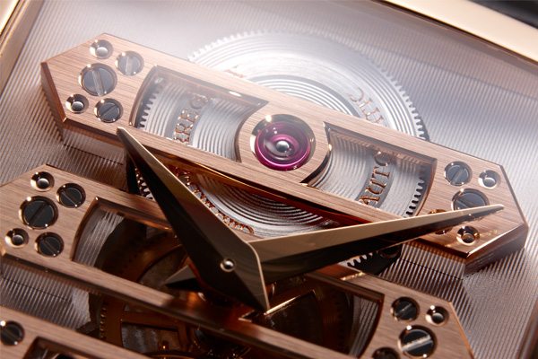 於是,進入腕錶時代後,芝柏決心重現金橋的經典,然而重現三金橋,並不只是在面盤上擺上三枚精雕細琢的金質箭型橋架而已,為了搭配金橋設計的美感與視覺上的平衡,發條盒、運作時分針的齒輪盤、陀飛輪三者呈直線分別固定於一條金橋下。而也因為如此,纖細的橋架也加強了機芯零件的固定。因此,面盤的三枚細膩金橋可不只是裝飾好看,而也有其實用價值的。此外,更進一步的是為了讓使用上更方便,新的金橋加入了自動上鍊機制,並採用微型自動盤,且將之悄悄隱藏於發條盒之後。如此的設計,在外觀上毫無影響機芯結構與美感,無論正反,都維持了機芯視覺上的和諧,同時也突顯出了金橋機制的佈局。