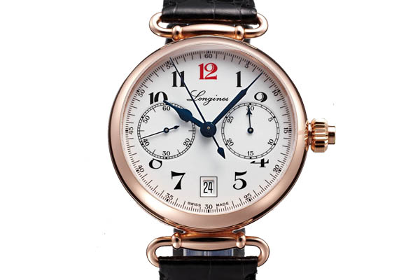 此款導柱輪單按把計時碼錶是浪琴為慶祝創立180週年而推出的復刻錶款,外觀類似浪琴表於1913年的首款計時手錶,然錶殼以更為奢華的玫瑰金取代一世紀前風行的鍍鉻錶殼。白色面盤上配備亮紅色「12」時標,是早期浪琴錶曾使用的品牌「Agassiz」偏好的配置。活動式錶耳是1913年起使用Cal.13.33Z的計時手錶最常使用的型式,在複刻款上仍然保留,更具懷舊樂趣。
