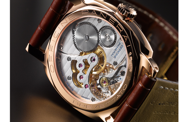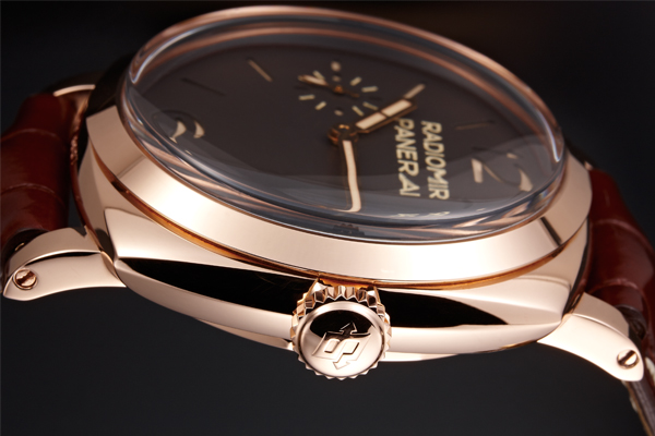 除了上述的經典元素之外,Radiomir 1940 Oro Rosso限量腕錶以18K紅金錶殼搭配棕色錶盤,它所採用的5NPt紅金材質,也是沛納海首度使用的新合金。目前廣泛運用在錶殼中的18K貴金屬材質,通常以其編號來區分顏色,常見的18K黃金編號為2N,其成分為75%的純金加上16%的銀與9%的銅,而顏色更紅潤的玫瑰金則為3N(75%純金加12.5%銀與12.5%銅)、4N(75%純金加9%銀與16%銅)與5N(75%純金加4.5%銀與20.5%銅),隨著含銅量的不同,材質的外觀也就更紅潤。本款腕錶所採用的5NPt紅金材質,是屬於色澤最深的等級,其銅的含量高達24.1%,材質中還有添加0.4%的鉑金,可幫助防止金屬出現氧化,保持外觀的亮麗與光澤。這種全新的K金材質,沛納海在今年首次運用,旗下另一款Radiomir PAM00395亦同步採用。