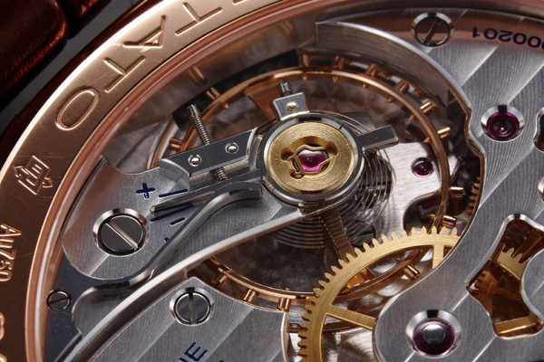 而機芯的機板與夾板經過細膩的修飾,分別施以魚鱗紋與日內瓦波紋,零件的邊緣皆以倒角拋光處理,展現精湛的工藝水準。而中央的夾板特別以局部鏤空設計,一絲不苟的打磨細節,也可從走時輪系與大小捲車齒輪上觀察到。而本枚機芯採用大型平衡螺絲擺輪與菲利浦曲線的雙層游絲,以及每小時18,000轉的振頻設計,具有濃厚的復古風格,反覆運轉的巧妙姿態,也是現代機芯上所少見的。擺輪夾板上方的鹅頸式微調裝置,不僅能精確調整時間快慢,同時完美呈現傳統機芯的視覺美感。