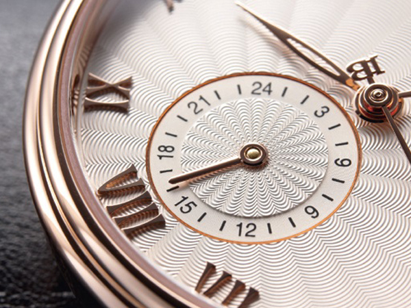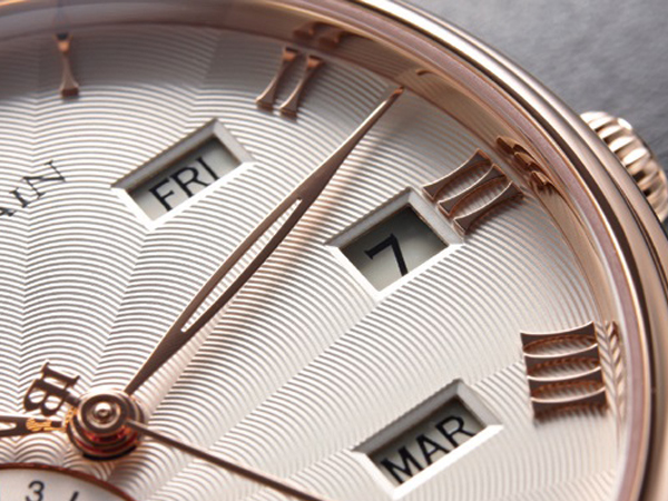 年曆錶最大特點就是每年只要在二月底調整日期,其餘月份會依大小月自動調整30或31天,功能性不比萬年曆錶,但製作難度及使用風險降低不少,因此深受歡迎。玫瑰金錶殼來自Villeret家族,銀色金屬面盤塗以透明瓷漆,有偏心放射狀紋飾,玫瑰金色時標及指針是寶鉑偏好的羅馬數字及柳葉針,雙圈處理的簡單錶殼清爽恬淡。