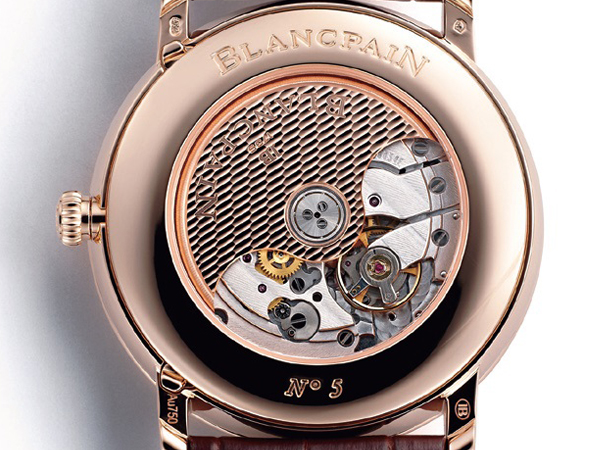 透過錶背可以看見這枚機芯,K金自動盤上刻有BLANCPAIN字樣及立體紋飾,自動盤用上滾珠軸承,新一代寶鉑機芯漸漸採用這項設計,雙發條盒提供72小時儲能,品質極佳。