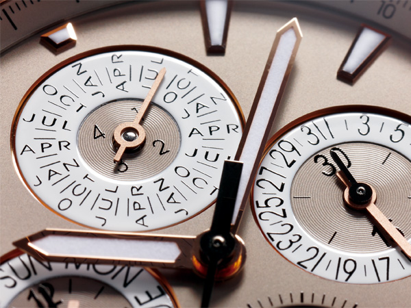 這款錶雖然有明顯的運動屬性,但它的面盤指示功能與製作品質只有溫文儒雅能夠形容,相信世界上沒有其他品牌能把運動錶製作到如此充滿書卷氣與華貴。面盤的顏色難以形容,主要是黃金底色,與錶殼材質搭配,但又不張揚而雋永,鑲貼時標內塗有夜光材料,副面盤以白色與主要面盤區隔,但內盤則恢復原色。氣氛傳統的萬年曆錶市面上不罕見,但配色如此兼具現代感與傳統性者絕無僅有。它是四十八個月循環一周的萬年曆錶,機芯的基礎是FREDERIC PIGUET,江詩丹頓社內編號是1136 QP。