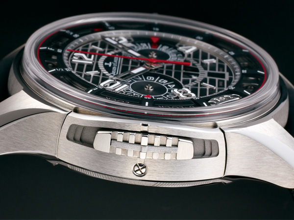 AMVOX7 Chronograph計時碼錶,融合了Extreme LAB2環形動能顯示概念,以及AMVOX2 DBS垂直啟動計時裝置和鎖定開關裝置,不只是功能複雜之外,同是技術不斷向上提升的證明。本款特色之一,是面盤最外圍10點到2點鐘位置是儲能65小時的環形對開動能顯示,而所謂對開,是滿鏈時紅色動力顯示會集中整個環形槽,待腕錶使用動能逐漸減少時,就會慢慢往左、右兩側各自向下滑動。
