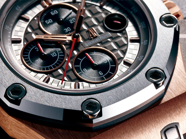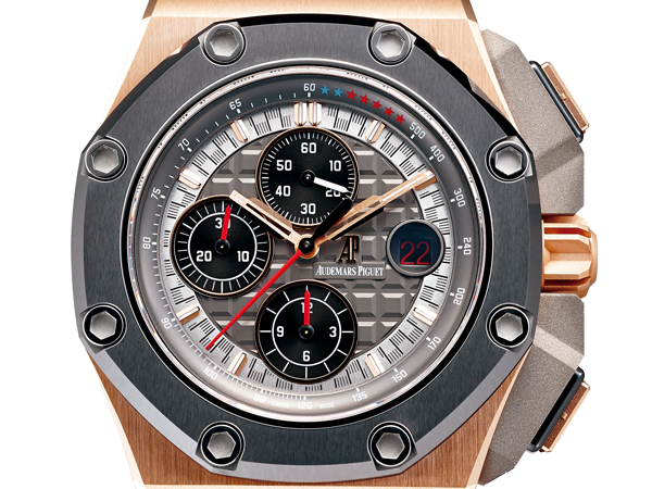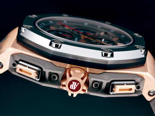 錶款採用44mm的錶殼尺寸設計,並改用長方形的計時按把設計,按把以陶瓷製作,頂端則是以18K玫瑰金製成。透過噴砂處理的鈦金屬護橋結構,可保護按把與錶冠,免於遭受碰撞而損壞,同時錶款的整體風格也更加豪邁粗曠。特殊設計的錶冠,外觀類似於汽車輪框的中央支架,錶冠的頂端則飾有愛彼標誌的紅色陽極氧化鋁製夾板,展現賽車運動的熱情精神。