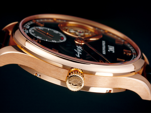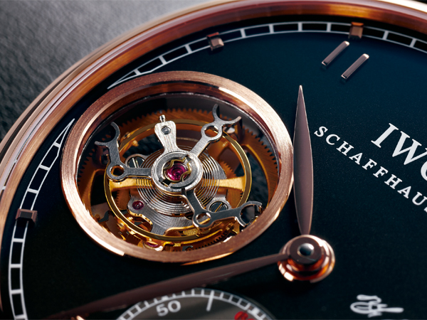 它的飛行陀飛輪在九點鐘方向,造型特殊的籠架有IWC一貫的味道。玫瑰金款搭配黑色面盤;與先前的葡萄牙系列最大差異在銀色小秒針盤,這點比較特別,而60秒的刻度以紅色印製,則沿襲了較古老的刻度繪製習慣,有些品牌會把五秒及倍數秒以紅色標示,有些僅標示60秒處。