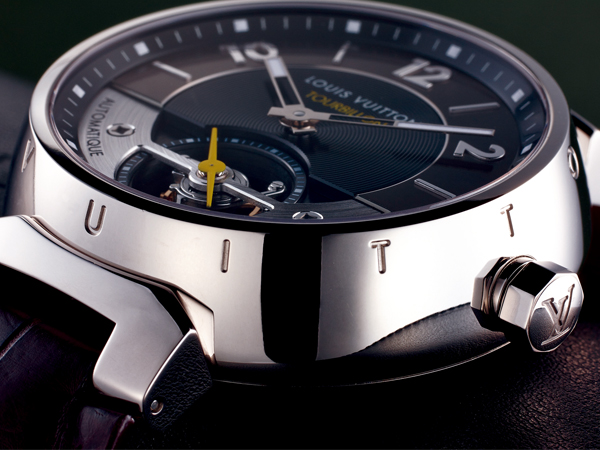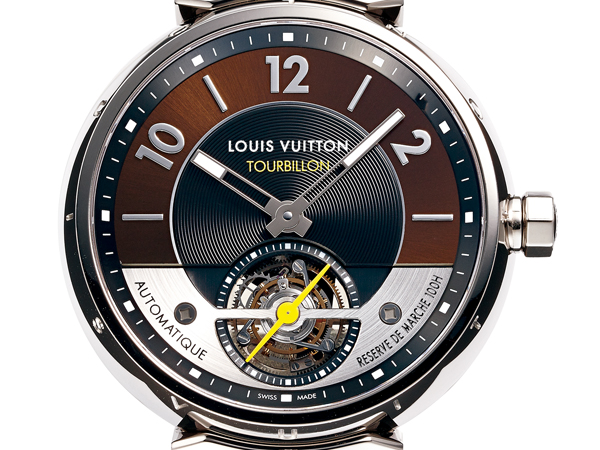 本只錶款的外觀仍延續Tambour系列的設計,拋光的錶殼周圍,鐫刻著LOUIS VUITTON的字樣;而本錶款採用44mm的大尺寸設計,除了配合直徑較大的機芯之外,也符合現今流行的大錶風潮。錶款的面盤,採用黑色與深咖啡色的設計,加上黃色的小秒針,展現路易威登的品牌風格。位於面盤下方,陀飛輪裝置的支架,則是採用銀色拉絲拋光的設計,兩旁的螺絲更以商標圖案為概念,流露出設計巧思。