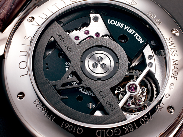 而錶殼內所搭載的LV95自動上鍊機芯,是一枚具有100小時動力儲存的陀飛輪機芯,由Dimier 1738機芯廠提供,然後再由路易威登加以修飾處理。LV95機芯內部具有兩個相連的發條盒,可以提供長達四天的動力,超越目前許多的陀飛輪錶款;另外透過使用陶瓷滾珠軸承的自動盤,與單向自動上鍊結構,配戴於手腕之上,亦可提供充足的動能。