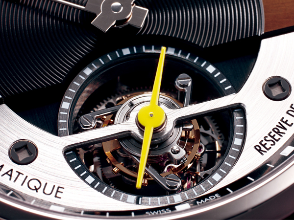 此外,本款機芯所採用的陀飛輪裝置,也有特別獨到之處。因為大部分的陀飛輪機芯,都是以三番車齒輪來推動陀飛輪框架下方的齒輪,然後擒縱輪開始圍繞著固定的四番車轉動;本款機芯則是由走時輪系齒輪,直接推動陀飛輪框架外側的齒輪,然後再由擒縱輪圍繞著固定的四番車。雖然兩者運作原理都相同,也都是1分鐘旋轉一周,但是視覺的效果卻各有所長。因為從機芯背面觀賞陀飛輪框架的運轉時,少了龐大的三番車齒輪,以及厚重的框架底座,能清楚且毫無阻礙的窺見框架與輪系的運轉,並可了解陀飛輪的運作原理。
