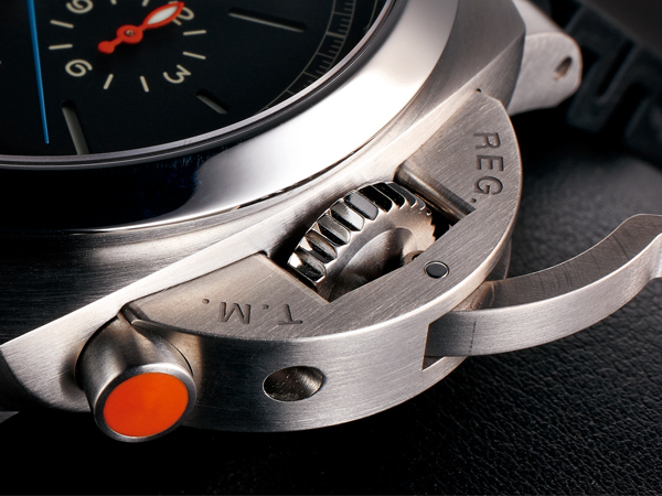 碩大的47mm直徑鈦合金錶殼無疑是它的另一項賣點,拉絲處理的殼身搭配拋光錶圈。黑色面盤是沛家招牌三明治結構,經典大號直線時標及數字,配上Luminor的專利護橋,沒有人會認錯它的來歷。按把上也都刻有功能字母首字,倒數計時按把上則塗有橘紅色。鏡面一如以往,採用厚度達到16mm的藍寶石水晶磨製,也採用透明底蓋,才能讓人看到自製的計時機芯。