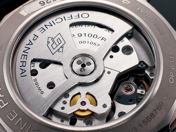 這枚機芯的動力來源是雙發條盒,自動盤則是雙向上鍊,它採用無卡度的自由游絲,搭配精密可調螺絲擺輪,調整時間精確可靠。整枚機芯以328枚零件構成,振動頻率為每小時28,800轉;完全由沛納海自行開發、製作及組裝。