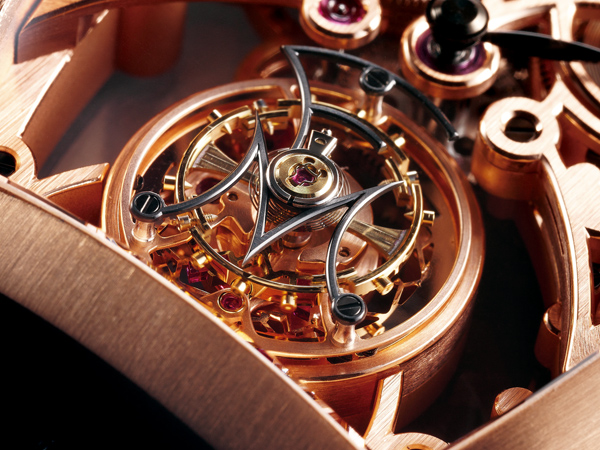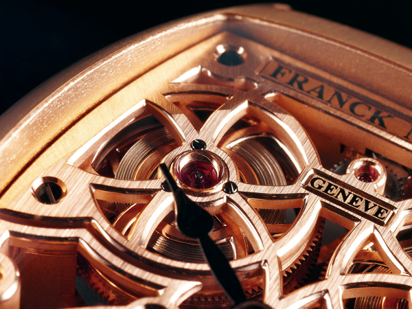 之所以需要用到四枚發條盒加強出力的另一個原因,在於所配備的專利擒縱系統的特殊設計,FRANCK MULLER跳脫過往的陀飛輪結構,改以五番車取代四番車帶動陀飛輪框架轉動。
