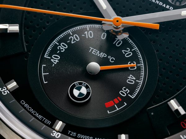 善於將結構特色融入的Magali Metrailler,同樣從BMW車體中擷取靈感,為了表現出光滑的烤漆質感,錶殼以DLC類鑽碳處理,同時能強化硬度與延長使用年限,錶冠上的防滑凹槽,來自經典柵欄式的水箱罩設計,1點鐘位置的日期顯示如同是公里累積表,面盤中央孔狀設計是仿造真皮座椅的透氣孔,14支立體柱形時標,採用代表廠方特色之一的自體發光微型氣燈,在夜間時如同BMW霸氣車頭燈一樣明亮,6點鐘位置試測溫計,靈感來自於轉速表,指針、秒針都塗上象徵BMW的Inka橘色系,並利用高低落差的層次,仿造出如汽車儀表板中的視覺效果。