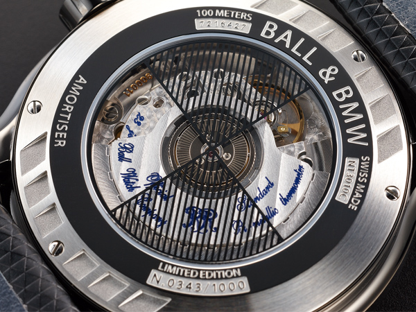 本款搭載BALL 9018自動上鍊機芯,並通過C.O.S.C瑞士天文台認證,BALL WATCH另一個專利是防震系統Amortiser,能降低衝擊、讓機芯得到保護。眼尖的錶迷和車迷一定能發現透明底蓋的設計創意,靈感來自於BMW LOGO經典的圖形。