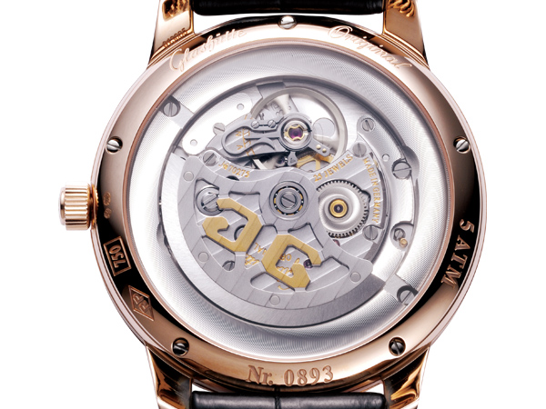 它代表了現代GO的傳承,所使用的機芯是正宗德製機芯GUB 10-30型機芯所改製的39型機芯,也是GO的第一款自製機芯,以能外掛各種複雜模組的平台為設計前提,不必多出一片基板,符合製作邏輯,而且一開始就設定為高機芯,所以打磨非常講究,同時採四分之三板配置,並且配備鵝頸微調,極具氣勢。尤其是自動盤上的鏤刻雙G字樣,更是令人難忘。
