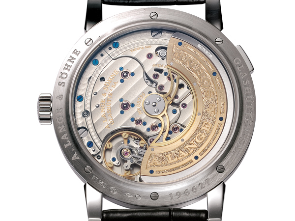 錶殼內所搭載的L021.1自動上鍊機芯,是朗格目前最華麗的自動機芯,具有七個藍鋼螺絲固定的黃金套筒,與一共67顆紅寶石軸承的設計,加上以黃金與鉑金製作的自動盤,耀眼的程度真是令人目不暇給。此外,本枚機芯也採用朗格自製的游絲,以及可精密調整快慢的鵝頸式微調裝置與砝碼擺輪。