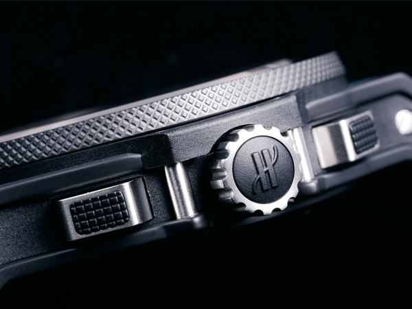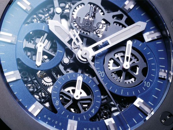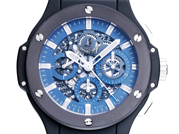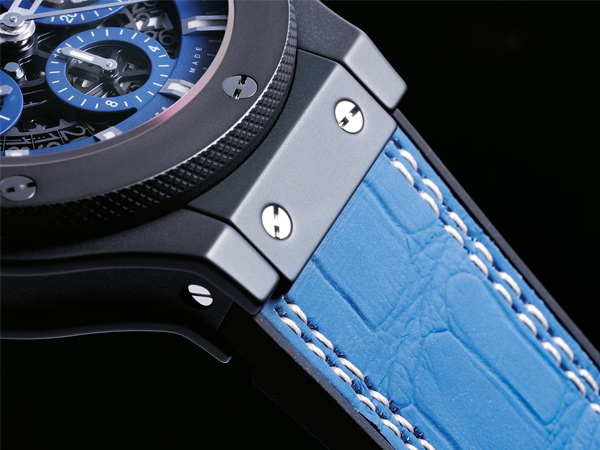 Big Bang的外型仍延續早期HUBLOT的傳統外型,但是不論在錶殼結構與材質的運用上,都有大幅度的革新。目前Bing Bang系列衍生出龐大的系列錶款,其中採用黑色系的陶瓷錶款,也是本系列最受歡迎的款式之一。這只Bing Bang Aero Bang Denim 44mm,使用黑色陶瓷的錶殼與錶圈設計,並以6枚H形的拋光鈦金屬螺絲固定,然後再結合不鏽鋼材質的錶冠與計時按把。