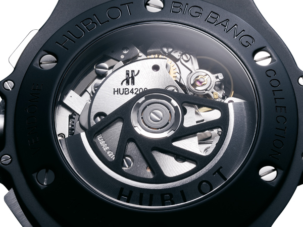 這枚編號為HUB 4214的自動機芯,以SELLITA機芯廠的SW500自動機芯為基礎然後再加以改良。其中最大的改變,就是將機芯前方的部分零件採用鏤空設計,同時以透明水晶來製造日期環,製造出複雜的鏤空效果。